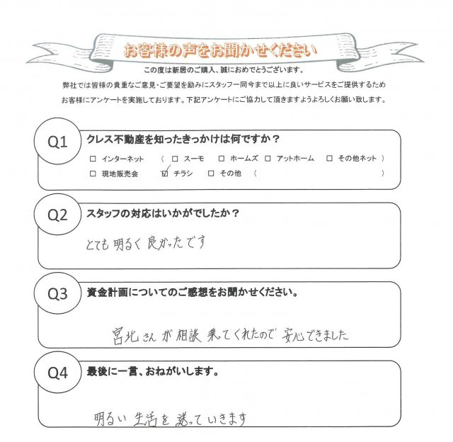 この度は弊社にて住宅をご購入頂き、有難うございました。また、ご満足頂けるお手伝いが出来た事を大変光栄に思います。