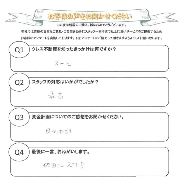 この度はクレス不動産にて、ご成約を頂きまして誠にありがとうございます。